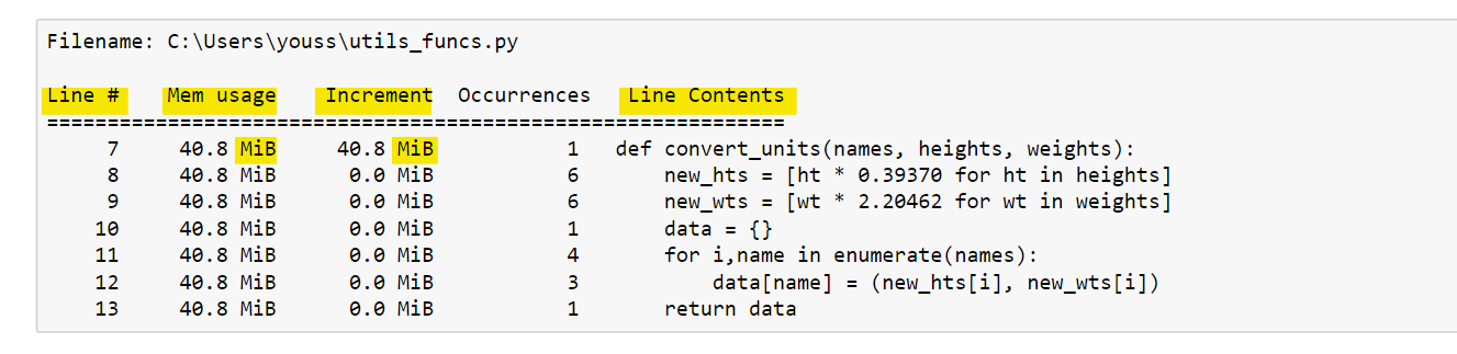 It is noteworthy to mention that memory is reported in mebibytes. Although one mebibyte is not exactly the same as one megabyte, for our purposes, we can assume they are close enough to mean the same thing. Another worth noting is that the memory_profiler package inspects memory consumption by querying the operating system.