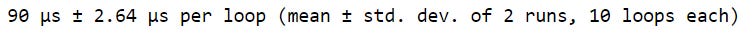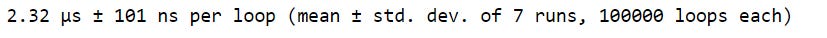 nums.append(x)We can also save the output of %timeit into a variable using the -o flag. This allows us to dig deeper into the output and see things like the time for each run, the best time for all runs, and the worst time for all runs.