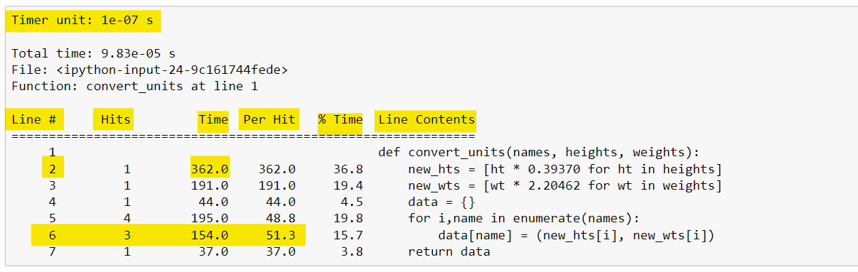 convert_units(names, hts, wts)If we wanted to get an estimated runtime of this function, we could use %timeit. But this will only give us the total execution time. What if we wanted to see how long each line within the function took to run? One solution is to use %timeit on each individual line of our convert_units function. But that’s a lot of manual work and not very efficient.