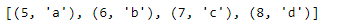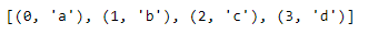 print(indexed_letters_list)We can also specify the starting index of enumerate with the keyword argument start. Here, we tell enumerate to start the index at five by passing start equals five into the function call.