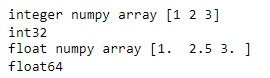 print(nums_np)NumPy arrays are homogeneous, which means that they must contain elements of the same type. We can see the type of each element using the .dtype method.