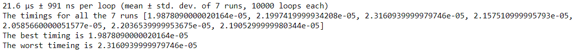 %timeit rand_nums = np.random.rand(1000)As we can see, %timeit provides an average of timing statistics. This is one of the advantages of using %timeit. We also see that multiple runs and loops were generated. %timeit runs through the provided code multiple times to estimate the code’s average execution time.