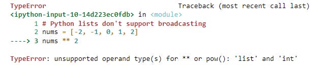 It’d be nice if we could simply square the list and get a list of squared values returned. Unfortunately, Python lists don’t support these types of calculations.