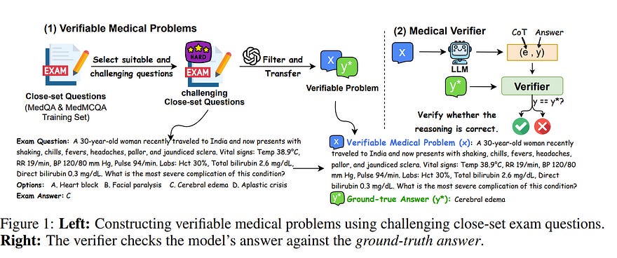 To address this, we propose verifiable medical problems with a medical verifier to check the correctness of model outputs. This verifiable nature enables advancements in medical reasoning through a two-stage approach: